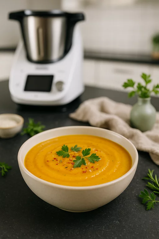 Vegane Möhrensuppe mit Curry – cremig, gesund und perfekt für den Monsieur Cuisine.